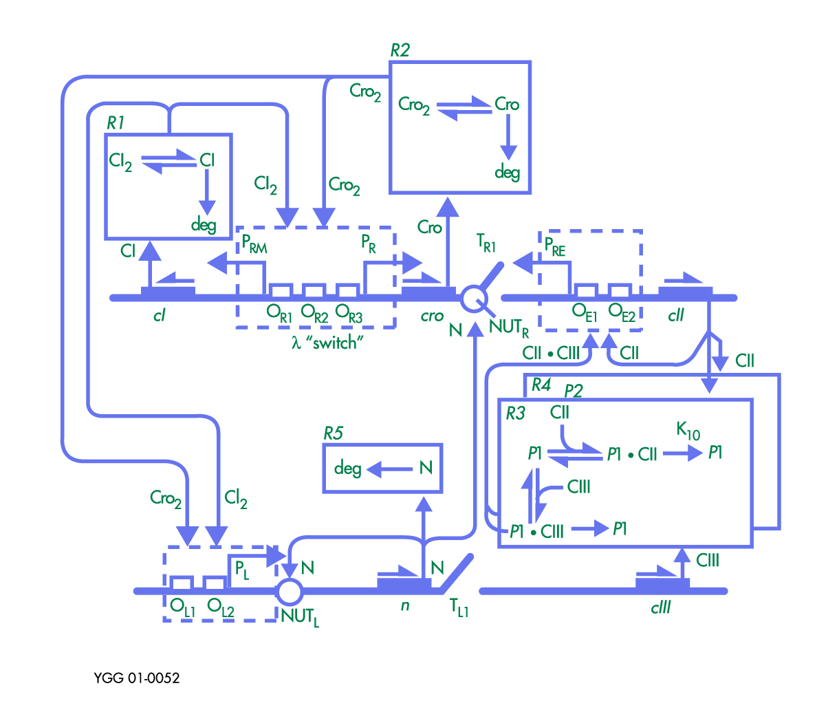 Model van die besluitnemingsbane van die Lambda-virus. Die dik horisontale lyne verteenwoordig die virus se DNS, terwyl die afkortings spesifieke gene aandui. Bron: Genome Management Information System, Oak Ridge National Laboratory.